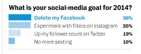 Lots of data points showing fatigue with Facebook. Teens on Snapchat. The most interesting is angst driven where Facebook paradoxically makes people feel unhappy because it appears as if your entire friend circle has the greatest lives ever. New Year’s resolutions from Marie Claire magazine show 36% of people polled wanting to delete their Facebook account. That is a big number.